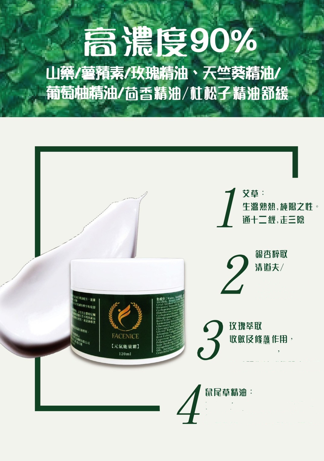 含舒緩因子,大豆異黃酮,銀杏萃取艾草萃取、 山藥萃取植物性複合物、降低、皮膚不適感含有歐洲七葉樹萃取、甘草酸胺、葡萄糖酸鋅、咖啡因減